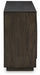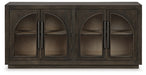 Details Made with solid wood and veneer, Inset wood base, Two-tone finish (dark grayish brown with light wire brush effect, lighter finish on interior), Inset wood base, Door fronts with arched glass panels, Dark pewter-tone door pulls, 4 doors, 2 shelves, Openings in back for electronics