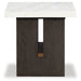 Dressed to thrill, this simply stunning end table offers a high-design look at a down-to-earth price. Ultra-sleek lines are accentuated with a dark waxy brown oak finish that’s so easy on the eyes. Clean-lined and modern, the plinth base and natural marble tabletop showcase quality craftsmanship and attention to detail. This table is the perfect sofa companion for a living room or family space, with a timeless look that's made to last.