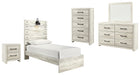 Details B192-46: Made of engineered wood (MDF/particleboard) and decorative laminate, Wispy white finish over replicated oak grain with authentic touch, Large-scale hardware with dark finish, 5 smooth-gliding drawers, Drawer interiors are lined with a faux linen laminate for a clean, finished look, Safety is a top priority, clothing storage units are designed to meet the most current standard for stability, ASTM F 2057 (ASTM International), Drawers extend out to accommodate maximum access to drawer interior while maintaining safety, B192-92: Made of engineered wood (MDF/particleboard) and decorative laminate, Wispy white finish over replicated oak grain with authentic touch, Large-scale hardware with dark finish, 2 smooth-gliding drawers, Drawers lined with faux linen laminate for finished aesthetic, 2 slim-profile USB charging stations, Power cord included; UL Listed, B192B1: Includes dresser with mirror, Made of engineered wood (MDF/particleboard) and decorative laminate, Wispy white finish over replicated oak grain with authentic touch, 6 smooth-gliding drawers, Drawer interiors are lined with a faux linen laminate for a clean, finished look, Large-scale hardware with dark finish, Mirror attaches to back of dresser, Assembly required, B192B2: Includes headboard, footboard and rails, Made of engineered wood (MDF/particleboard) and decorative laminate, Wispy white finish over replicated oak grain with authentic touch, Decorative sconce light, LED with 3 AA batteries, 2 slim-profile USB charging ports, Power cord included; UL-listed, Foundation/box spring required, sold separately, Mattress available, sold separately, Assembly required, Bed is compatible with an adjustable base,