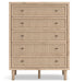 Clean-lined and contemporary—but far from stark—this bedroom package is a fresh style awakening. Pairing a light finish with replicated oak grain and textured beige details that replicate the look of cane, its mixed materials bring a naturally versatile vibe to your bedroom. Sleek, simple hardware plays perfectly with the modern aesthetic.