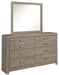 Details Made of engineered wood (MDF / particleboard) and decorative laminate in vintage warm gray with subtle pearl effect over replicated cherry grain, Pewter-tone hardware, 6 smooth-gliding drawers with replicated linen lining, Mirror attaches to back of dresser, Assembly required, Includes tipover restraint device