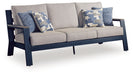 Easy-breezy beauty, made to withstand the elements. This outdoor sofa makes a serene statement with its soothing shade of blue and contrasting wood-look arms. A cushioned seat and back keep you comfy as you lounge. Crafted with durable materials for added longevity, it's a smartly stylish addition to your outdoor oasis.