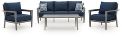 Details Includes sofa, 2 chairs and coffee table, Made with aluminum, Pewter-tone finish, All-weather foam cushion core wrapped in soft polyester, Zippered cushions and throw pillows covered in solution-dyed high-performance fabric, Nuvella® is an outdoor fabric that can be cleaned and offers UV resistance, Clean fabric with mild soap and water, let air dry; for stubborn stains, use a solution of 4 oz. bleach to 28 oz. water, Stainless steel hardware, Designed to withstand the harsh elements of the outdoors, 2 throw pillows included, Assembly required