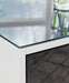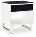 Details Made with MDF substrates, High-gloss white finish, Black glass tabletop; black acrylic laminate drawer front, Smooth-gliding storage drawer, Open display shelf, Legs with chrome-tone finish Made with MDF substrates, High-gloss white finish, Black glass tabletop; black acrylic laminate drawer front, Smooth-gliding storage drawer, Open display shelf, Legs with chrome-tone finish, Assembly required