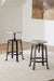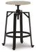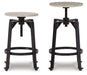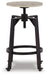 Details Made with acacia veneer and engineered wood, Distressed whitewash finish, Metal frame with black finish, Adjustable-height swivel seat, Footrest, Assembly required