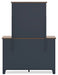 Details B414B10: Includes panel headboard, footboard, rails and slats, Made with hardwood solids, mindi wood veneer and MDF substrates, Two-tone finish features a dark slate blue with a light brown wood-tone top, Foundation/box spring required, sold separately, Mattress available, sold separately, Assembly required, B414B1: Includes dresser and mirror, Made with hardwood solids, mindi wood veneer and MDF substrates, Two-tone finish features a dark slate blue with light brown wood-tone top, Nickel-tone metal knobs, 6 drawers with fully finished interior, dovetail construction and heavy duty ball-bearing side glides, Mirror attaches to back of dresser, B414-92: Made with hardwood solids, mindi wood veneer and MDF substrates, Two-tone finish features a dark slate blue with a light brown wood-tone top, Nickel-tone metal knobs, 2 drawers with fully finished interior, dovetail construction and heavy duty ball-bearing side glides,