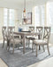 Details D291-25: Made of engineered wood, Tabletop made of melamine with a replicated barn wood effect, MEGA-TUFF® melamine surfaces are made of easy-clean melamine which is heat-, scratch-, water- and stain-resistant, Dining table with tapered legs and a gray finish, Seats up to 6, Assembly required, D291-01: Made of wood, Light beige woven polyester upholstery and gray finish, X-back design with tapered legs, Assembly required,