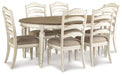 Details D743-35: Made of veneers, wood and engineered wood, Antiqued two-tone finish, Separate extension leaf, Table extends by pulling both ends and dropping in leaf, Seats up to 6, Assembly required, D743-01: Made with wood and engineered wood, Distressed, chipped white finish, Ladderback styling, Polyester upholstery over foam cushioned seat, Assembly required,