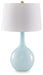 Details Made of glass with modified drum hardback fabric shade, Aqua finish, 3-way switch, 1 E26 socket, type A bulb recommended (not included); 150 watts max or LED equivalent; UL Listed, Due to the finishing process of this product, some variations may occur, Assembly required