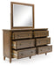 | Details | B787B4: Includes upholstered headboard, panel rails and bench footboard with slats, Made with hardwood solids, veneers and MDF substrates, Brown finish, Polyester upholstery, Nailhead trim, Turned feet, Foundation/box spring required, sold separately , Mattress available, sold separately, Assembly required, B787B1: Includes dresser and mirror, Made with hardwood solids, veneers and MDF substrates, Brown finish, Oil-rubbed bronze-tone knobs, 6 drawers with fully finished interior, dovetail construction and heavy duty ball-bearing side glides (top drawers felt lined), Turned feet, Mirror attaches to back of dresser, B787-93: Made with hardwood solids, veneers and MDF substrates, Brown finish, Oil-rubbed bronze-tone knobs, 2 drawers with fully finished interior, dovetail construction and heavy duty ball-bearing side glides (top drawer felt lined), Turned feet, 110V power supply with USB-A and USB-C charging ports, Power cord included; UL Listed, | |
