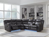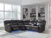 This reclining sectional pairs the luxe look of faux leather with must-have functional features. LED lights on the underside put a modern twist on the simply chic design—choose from three colors to add ambiance to movie night or gaming with friends. And you can keep remotes, drinks and other entertainment essentials close with the handy console. Ready to relax? Easy pull tab reclining has you stretched out in no time.