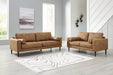 Small-scale style, tailored to perfection. This seating package echoes retro aesthetics with warm caramel faux leather, while its ultra-linear silhouettes incorporate a contemporary edge. Versatile in form and function, this set suits styles from modern boho to transitional. And its size helps you to confidently curate your compact space without sacrificing comfort (or your budget).