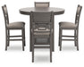 Details Includes counter height dining table and 4 upholstered bar stools, Table made with rubberwood solids, mindi veneer and MDF substrates, Stool made with solid wood and engineered wood, Light gray finish, Tabletop has reverse diamond patterned veneer, Thick tapered legs, 2 lower shelves, Stool with light gray textured polyester upholstery, Foam cushioned seat and backrest, Stool backrest features fretwork accent, Seats up to 4, Assembly required