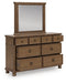 | Details | PCB824B5: Includes poster headboard, footboard and rails , Made with hardwood solids, mango wood veneer and MDF substrates , Side rails feature laminated solid hardwood slat support rails (or LVL) with glued and screwed blocking for added strength, Medium brown wood-tone finish , Foundation/box spring required, sold separately, Mattress available, sold separately , Assembly required, PCB824B1: Includes dresser and mirror, Dresser made with hardwood solids, mango wood veneer and MDF substrates , Mirror made with solid wood, Medium brown wood-tone finish, Metal hardware with pewter-tone finish, 8 smooth-gliding drawers with fully finished interiors, French/English dovetail construction and heavy-duty ball-bearing side glides (top drawers felt lined), Mirror attaches to back of dresser, PCB824-93: Made with hardwood solids, mango wood veneer and MDF substrates, Medium brown wood-tone finish, Metal hardware with pewter-tone finish, 3 smooth-gliding drawers with fully finished interiors, French/English dovetail construction and heavy-duty ball-bearing side glides, Top drawer felt lined, 110V power supply with USB-A and USB-C charging ports, Power cord included; UL listed, | |