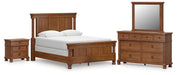 | Details | PCB824B2: Includes poster headboard, footboard and rails , Made with hardwood solids, mango wood veneer and MDF substrates , Side rails feature laminated solid hardwood slat support rails (or LVL) with glued and screwed blocking for added strength, Medium brown wood-tone finish , Foundation/box spring required, sold separately, Mattress available, sold separately , Assembly required, PCB824B1: Includes dresser and mirror, Dresser made with hardwood solids, mango wood veneer and MDF substrates , Mirror made with solid wood, Medium brown wood-tone finish, Metal hardware with pewter-tone finish, 8 smooth-gliding drawers with fully finished interiors, French/English dovetail construction and heavy-duty ball-bearing side glides (top drawers felt lined), Mirror attaches to back of dresser, PCB824-93: Made with hardwood solids, mango wood veneer and MDF substrates, Medium brown wood-tone finish, Metal hardware with pewter-tone finish, 3 smooth-gliding drawers with fully finished interiors, French/English dovetail construction and heavy-duty ball-bearing side glides, Top drawer felt lined, 110V power supply with USB-A and USB-C charging ports, Power cord included; UL listed, | |