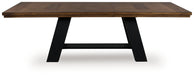 Details Includes dining extension table top and base, Base made with hardwood solids, veneer and MDF substrate, Table top made with hardwood solids, mango wood veneer and MDF substrate, Two-tone finish (mindi wood veneer inlay top with medium brown finish; base with painted black finish), Table extends by pulling both ends and dropping in leaf , Heavy-duty ball-bearing equalizing table glide system, Extends smoothly thanks to easy-glide technology, Seats up to 10 , Assembly required