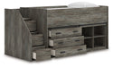 Details Includes loft bed, left storage steps with loft ends, roll slats, loft bookcase and loft drawer storage, Made with engineered wood (MDF/particleboard/plywood) and decorative laminate for the right balance of affordability and durability, Rustic warm gray finish over replicated oak grain with authentic touch, Decorative laminate replicates natural or man-made material surfaces with consistent color, pattern and texture, 4 storage cubbies, 3 smooth-gliding storage drawers, Bed does not require additional foundation/box spring, Mattress available, sold separately, Assembly required