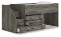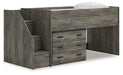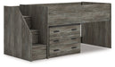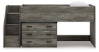 | Details | Includes loft bed, left storage steps with loft ends, roll slats and loft drawer storage, Made with engineered wood (MDF/particleboard/plywood) and decorative laminate for the right balance of affordability and durability, Rustic warm gray finish over replicated oak grain with authentic touch, Decorative laminate replicates natural or man-made material surfaces with consistent color, pattern and texture, 3 smooth-gliding storage drawers, Bed does not require additional foundation/box spring, Mattress available, sold separately, Assembly required | |