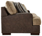 Details Corner-blocked frame, Loose seat and back cushions, High-resiliency foam cushions wrapped in poly fiber, Polyester interior upholstery and faux leather exterior upholstery, Throw pillows included, Pillows with feather-fiber fill, Bronze-tone nailhead trim, Platform foundation system resists sagging 3x better than spring system after 20,000 testing cycles by providing more even support, Smooth platform foundation maintains tight, wrinkle-free look without dips or sags that can occur over time with sinuous spring foundations