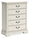 Add a touch of romance to your bedroom with this chest of drawers. Its antiqued white painted finish and serpentine-shaped silhouette details are the picture of easy elegance. Five spacious drawers offer ample storage space, while custom-designed bar pulls add originality.