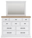 | Details | B844B2: Includes panel headboard, storage footboard, rails and roll slats, Footboard made with hardwood solids, MDF substrates and butcher block oak veneer, Headboard and rails made with hardwood solids and MDF substrates, White finish, Headboard with inset black metal barn sash, 2 drawers in footboard with fully finished interior, dovetail construction and ball-bearing side glides, Pulls with matte black finish, Bed does not require a foundation/box spring, Mattress available, sold separately, Assembly required, B844B1: Includes dresser and mirror, Made with hardwood solids, MDF substrates and butcher block oak veneer, Dresser with 2-tone finish (white finish; butcher block oak veneer with natural finish), Pulls with matte black finish, 10 spacious drawers with fully finished interiors (top drawers felt lined), dovetail construction and ball-bearing side glides , Drawers with inset picture fronts, Mirror attaches to back of dresser, | |