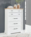Details B844B2: Includes panel headboard, storage footboard, rails and roll slats, Footboard made with hardwood solids, MDF substrates and butcher block oak veneer, Headboard and rails made with hardwood solids and MDF substrates, White finish, Headboard with inset black metal barn sash, 2 drawers in footboard with fully finished interior, dovetail construction and ball-bearing side glides, Pulls with matte black finish, Bed does not require a foundation/box spring, Mattress available, sold separately, Assembly required, B844B1: Includes dresser and mirror, Made with hardwood solids, MDF substrates and butcher block oak veneer, Dresser with 2-tone finish (white finish; butcher block oak veneer with natural finish), Pulls with matte black finish, 10 spacious drawers with fully finished interiors (top drawers felt lined), dovetail construction and ball-bearing side glides , Drawers with inset picture fronts, Mirror attaches to back of dresser, B844-46: Made with hardwood solids, MDF substrates and butcher block oak veneer, 2-tone finish (white finish; butcher block oak veneer with natural finish), Pulls with matte black finish, 5 spacious drawers with fully finished interiors (top drawers felt lined), dovetail construction and ball-bearing side glides, Drawers with inset picture frame fronts, B844-93: Made with hardwood solids, MDF substrates and butcher block oak veneer, 2-tone finish (white finish; butcher block oak veneer with natural finish), Pulls with matte black finish, 3 spacious drawers with fully finished interiors (top drawers felt lined), dovetail construction and ball-bearing side glides, 110V power supply with dual USB charging ports, Power cord included; UL Listed, Drawers with inset picture frame fronts,