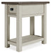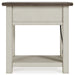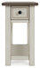 Details Made of wood, white oak veneers and engineered wood, Two-tone (weathered gray and antique white) finish, Chairside end table features plank-styled top, Smooth-gliding drawer perfect for holding remotes and more, Integrated 110V power supply with dual USB charging ports, Black faceted hardware, Assembly required