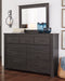 | Details | Includes dresser and mirror, Made with engineered wood and decorative laminate, Dark charcoal finish over replicated oak grain, 7 smooth-gliding drawers; 3 drawer sizes, Linear pulls with dark pewter-tone finish, Mirror attaches to back of dresser, Safety is a top priority, clothing storage units are designed to meet the most current standard for stability, ASTM F 2057 (ASTM International), Drawers extend out to accommodate maximum access to drawer interior while maintaining safety , Assembly required | |
