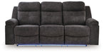 Seamlessly blend contemporary aesthetics and uncompromising comfort with this reclining sofa. Its handsome charcoal-hued faux leather has a tailored appeal thanks to sizable stitching details. As for modern convenience? The simple one-pull reclining and ambient LED lighting encourage you to relax in style.
