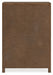 Details Made with hardwood solids, hickory veneer and MDF substrates, Light brown glazed finish to enhance the natural wood grain characteristics, Handles with aged pewter-tone finish, 5 drawers with fully finished interior, dovetail construction and ball-bearing side glides