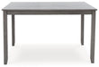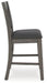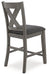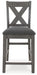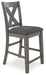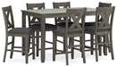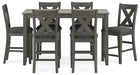 Details Includes counter height dining table and 6 counter height bar stools, Table made with hardwood solids, acacia veneer and MDF substrate, Stools made with solid hardwood frames, Antiqued gray wash finish, Polyester upholstery, Foam cushioned seats, Nailhead accents, Assembly required