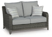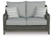 Add a distinguished touch of gray to your outdoor living space with this loveseat. It's made with resin wicker over an aluminum frame for a relaxed look that provides seasons of enjoyment. Rest assured, the thick seat and back cushions are wrapped in Nuvella® high-performance fabric that’s fade-resistant, stain-resistant and a breeze to clean.