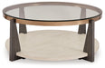 Details Made with solid wood, faux travertine laminate with MDF substrate and metal, Legs with grayish brown wood-tone finish, Metal frame with goldtone finish, Fixed lower shelf, Clear tempered glass tabletop, Assembly required