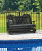 Drift away from everyday worries and into outdoor bliss with this glider loveseat. Dressed in chic black, the Adirondack-inspired design has a classic feel. It weathers sunny summer days and cozy winter nights with durable MEGA-TUFF® HDPE material. A drop-down console with integrated cup holders keeps refreshments and snacks within easy reach. With the console snapped into the back, this loveseat has even more room for enjoying lazy days in the shade.