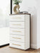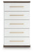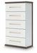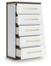 Details Made with engineered wood (MDF/particleboard/plywood) and decorative laminate for the right balance of affordability and durability, Two-tone finish (dark brown finish over replicated walnut grain; matte white finish), Decorative laminate replicates natural or man-made material surfaces with consistent color, pattern and texture, Handles with champagne finish, 5 smooth-gliding drawers, Drawer interiors are lined with a faux linen laminate for a clean, finished look, Safety is a top priority, clothing storage units are designed to meet the most current standard for stability, ASTM F 2057 (ASTM International), Drawers extend out to accommodate maximum access to drawer interior while maintaining safety, Minor assembly required