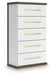 Looking to make a subtly striking statement in your bedroom? We've got you covered. This chest of drawers' sophisticated two-tone treatment marries a warm brown finish over replicated walnut grain with a matte white finish. Rounded corners and a thick top radiate an air of modern panache, while sleek handles in a champagne finish add a sparkling touch to the spacious drawers. It’s a master class in contemporary yet comfortable character.
