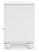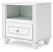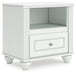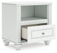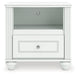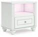 Details Made with engineered wood (MDF/particleboard/plywood) and decorative laminate for the right balance of affordability and durability, Matte white finish, Decorative laminate replicates natural or man-made material surfaces with consistent color, pattern and texture, Crystal drawer knob, 1 smooth-operating drawer, Drawer interior is lined with a faux linen laminate for a clean, finished look, Open shelf, USB-A and USB-C charging ports, Pink, purple and white LED lighting options; touch button control, Power cord included; UL Listed, Minor assembly required