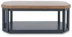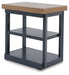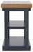Details Includes coffee table and 2 end tables, Made with hardwood solids, mindi veneer and MDF substrate, Tabletop with light brown wood-tone finish, Base with dark blue slate finish, Coffee table includes casters for easy mobility, End tables have 2 open shelves, Assembly required
