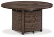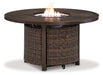 Details 48" round fire pit with CSA-approved 55,000 BTU stainless steel burner, glass beads, burner cover and protective all-weather cover, All-weather, handwoven resin wicker over rust-free aluminum frame, Aluminum wood-look top, Door conceals gas propane tank (not included), Convertible to natural gas, Battery-operated ignition system with adjustable flame control; battery included, Gas line or propane tank connector hose not provided, Assembly required