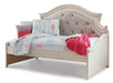 Elevating the art of traditional cottage styling, this darling day bed with storage is your dream bedroom retreat realized. A curvaceous beauty, this brilliant upholstered bed wows with dramatic scalloped details and fanciful trim work. The distressed chipped white finish charms with its heirloom appeal. Deep tufting on the cushioned upholstered bedstead adds such a cozy element sure to put you at ease. Mattress available, sold separately.