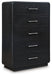 Details Made with hardwood solids and ash veneer, Black finish on textured wood grain surface, Burnished nickel-tone pulls, Waterfall edges, 5 smooth-gliding drawers with fully finished interior, dovetail construction and heavy duty ball-bearing side glides
