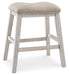 This upholstered stool invites you to raise the bar on small space living. An inspired choice for coastal chic or modern farmhouse settings, this comfortably cushioned stool sports a grayish white finish with rub-through effect for timeworn appeal.