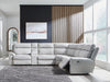 Details Includes 6 modular pieces: left-arm facing power recliner, 2 armless chairs, console with storage, wedge and right-arm facing power recliner , "Left-arm" and "right-arm" describe the position of the arm when you face the piece, Versatile modular pieces fit together in a variety of configurations, One-touch power control with adjustable positions, Easy View™ adjustable headrest and zero-draw USB port, Zero-draw technology only consumes power when the USB receptacle is in use, Zero-gravity mechanism allows optimum reclining comfort with infinite reclining positions at the touch of a button, Corner-blocked frame with metal reinforced seat, Attached cushions, High-quality foam cushions wrapped in poly fiber, Polyester upholstery, Console with 2 cup holders and hidden storage , Power cord included; UL Listed