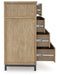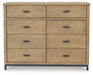 Details Made with hardwood solids, mango wood veneer, MDF substrates and metal, Light brown wood-tone finish, Gunmetal gray finish on metal legs, Metal bar pulls, 8 drawers with fully finished interior, dovetail construction and heavy duty ball-bearing side glides (top drawers felt lined)