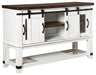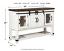 To those with an appetite for rustic farmhouse living, this server dishes out irresistible form and function. A pair of cabinet doors with mesh wire inlays add a countrified cool element. Sliding “barn doors” revealing even more shelved storage are right on trend. This server’s two-tone aesthetic pairs a distressed vintage white with an aged natural pine color top for twice the charm.