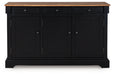 Details Made with hardwood solids, mango wood veneer and MDF substrate, Top with butcher block veneer pattern in deep brown wood tone finish, Base with warm satin black finish, Hardware with dark bronze-tone finish, 3 smooth-gliding drawers with felt lining and heavy-duty ball-bearing side glides, 3 cabinets, each with 2 adjustable shelves